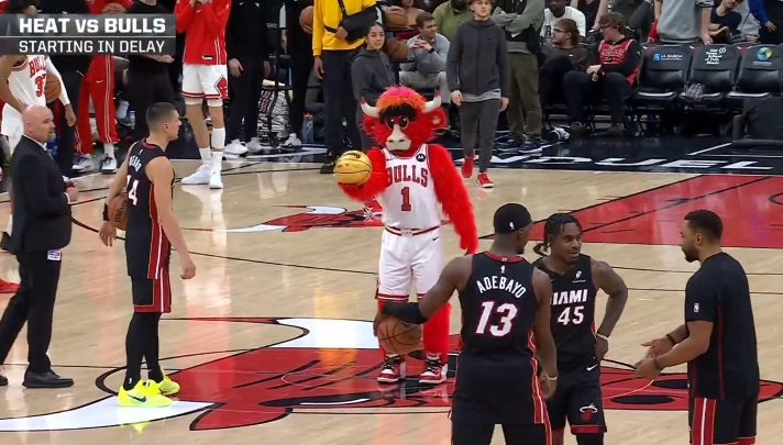 等待期间,热火球员希罗与公牛吉祥物进行半场背投比赛,结果公牛吉祥物一击命中,希罗见状宣布直接退出较量。