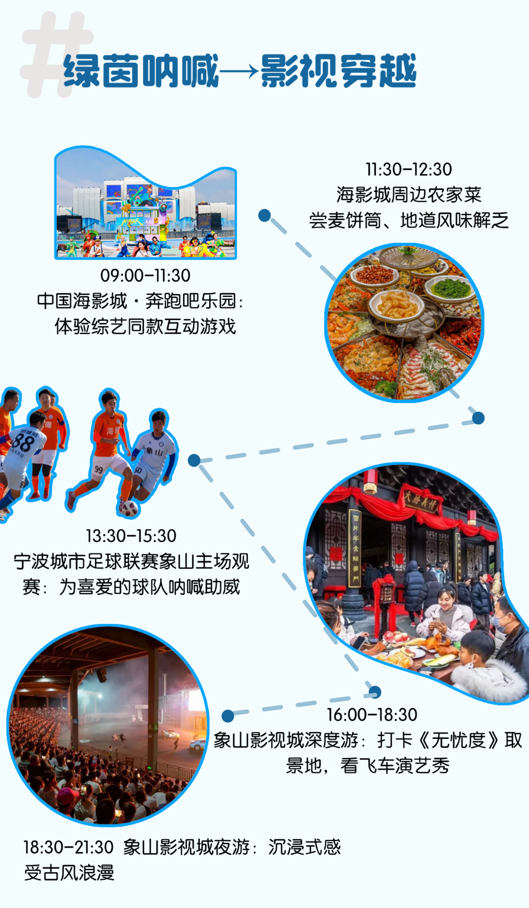 结合赛事小编贴心为您定制4条覆盖运动狂欢、美食寻鲜、影视穿越的特色全天路线,让观赛与游玩无缝衔接,一天时光充实又精彩~